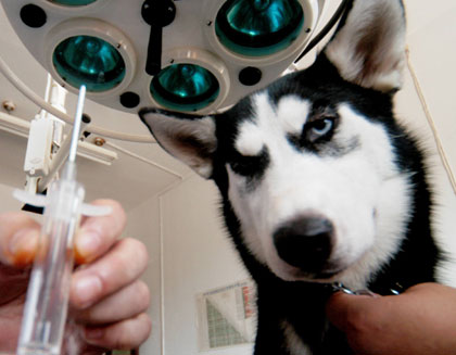 Dog with a chip (Xinhua) Updated: 2006-08-22 12:41  A vet (L, not in picture) is to inject a grain-sized ID chip under
