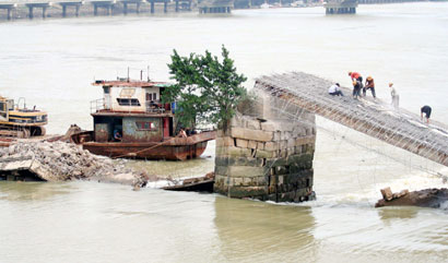 Workers dismantle an ancient bridge that collapsed in floods earlier this month in Quanzhou, Fujian Province August 24, 2006. The Shunji Bridge was built 800 years ago, and the local government decided to dismantle it to ensure the safety of the Jinjiang River. [Xinhua]