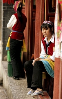 wait for customers at a shop at the World Cultural Heritage city, Lijiang Old
