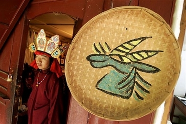 Reflections of Chinese Yunnan (Reuters) Updated: 2006-08-25 07:40  A Naxi ethnic minority man dressed in traditional dance costume near a bamboo basket with