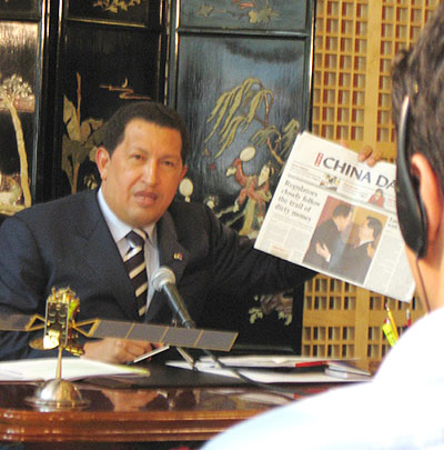Chavez holds press conference in Beijing (chinadaily.com.cn) Updated: 2006-08-25 17:54  Venezuelan President Hugo Chavez shows a copy of China Daily at a