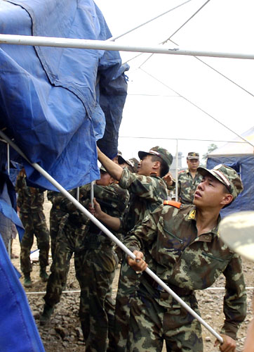 build tents for victims whose houses were destroyed in the earthquake in Yanjin County, Southwest China's Yunnan Province on