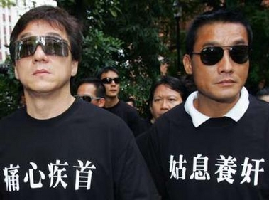 Twin outrage Updated: 2006-08-30 08:18  Hong Kong actors Jackie Chan (L), Tony Leung Ka-fai and others take