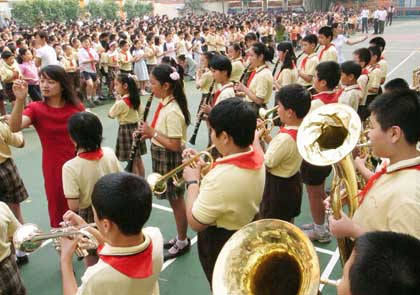 A school band performs at a ceremony of new semester at a primary
