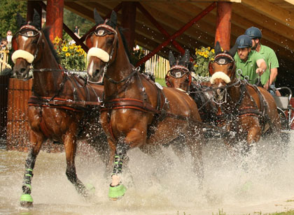 Germany's Christoph Sandeman (2R) drives through the water during the Marathon portion of the Driving Competition at the World Equestrian Games in Aachen August 31, 2006. [Reuters]