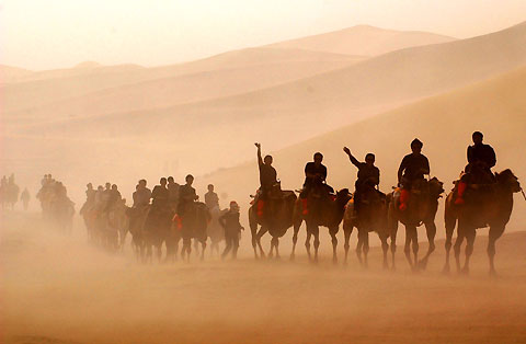 Tourists waves as sand wind envelops the Dunhuang Grottos in Northwest China's Gansu Province on September 2, 2006. [Xinhua]