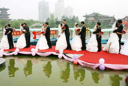 Wedding ceremony in Xi'an (Xinhua) Updated: 2006-09-03 20:58  Newly-wed couples pose for photos in a wedding ceremony in Xi'an,
