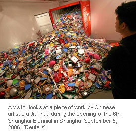 Models pose at art work of Chinese artist Shi Jinsong titled "Halong-Kellong" during the opening of the 6th Shanghai Biennial in Shanghai September 5, 2006.[Reuters]