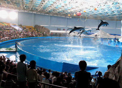 Spectators watch dolphins perform at the Qingdao Ocean World in Qingdao, East China's Shandong Province October 6, 2006. [Newsphoto]
