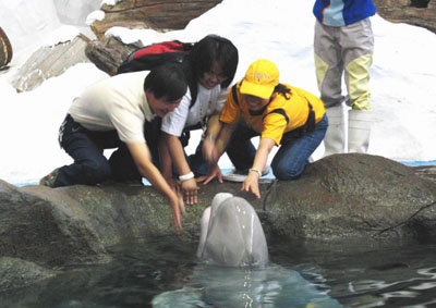 Visitors share a light moment with a dolphin at the Qingdao Ocean World in Qingdao, East China's Shandong Province October 6, 2006. [Newsphoto]