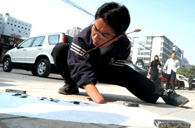 his ears in Lanzhou, Gansu Province October 16, 2006. Gao lost both of his hands