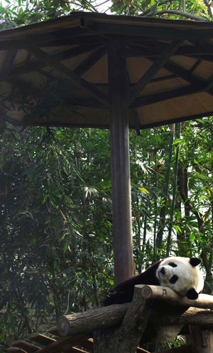 Lin Hui, a female giant panda sleeps in the Chiang Mai Zoo in Thailand on