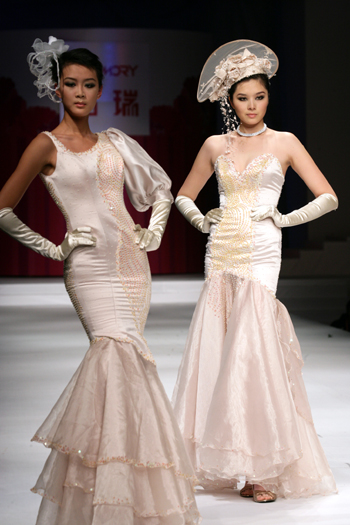 Models pose on the catwalk during a wedding gown design contest as part of the China Spring/Summer 2007 Fashion Week in Beijing on November 15, 2006. The fashion week attracted 35 designers from Europ and Asia, who will present their new collections in the week to come. [Newsphoto] |