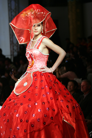 A model poses on the catwalk during a wedding gown design contest as part of the China Spring/Summer 2007 Fashion Week in Beijing on November 15, 2006. The fashion week attracted 35 designers from Europ and Asia, who will present their new collections in the week to come. [Newsphoto]