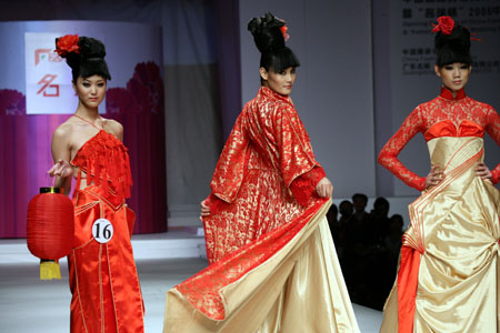 Models pose on the catwalk during a wedding gown design contest as part of the China Spring/Summer 2007 Fashion Week in Beijing on November 15, 2006. The fashion week attracted 35 designers from Europ and Asia, who will present their new collections in the week to come. [Newsphoto]