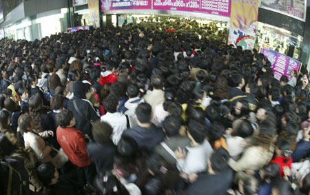 Hundreds of customers rush into a shopping mall after it opened in Hangzhou, east China Zhejiang province November 16, 2006. It was reported that the shopping centre was offering a special discount -- spending 800 yuan and getting 320 yuan back. [Reuters]