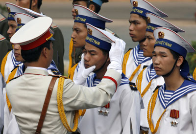 An officer adjusts the cap of a member of the Vietnamese navy before a ceremony to welcome China's President Hu Jintao at the presidential palace in Hanoi November 16, 2006. Hu is attending the Asia-Pacific Economic Cooperation (APEC) summit in Vietnam. [Reuters]