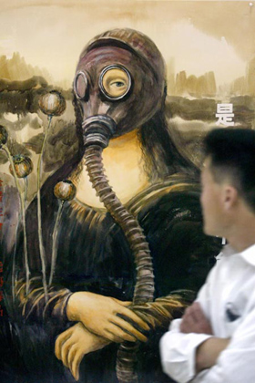 A visitor looks at a painting showing Mona Lisa wearing a mask at an exhibition promoting drug awareness in Hangzhou, east China's Zhejiang province June 26, 2006. June 26 marks the annual International Day against Drug Abuse and Illicit Trafficking. |