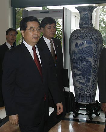 China's President Hu Jintao (C) is escorted by security personnel as he leaves a hotel in Hanoi November 18, 2006. Hu is in Vietnam to attend the Asia-Pacific Economic Cooperation (APEC) summit. [Reuters]