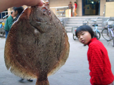 A girl takes a glance at turbot, a popular type of flatfish, on a