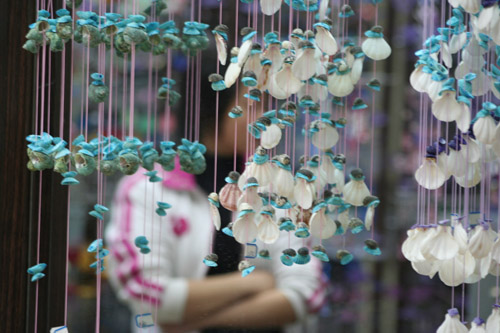 | A girl looks at the shell decoration in a booth in Yiwu, East China's