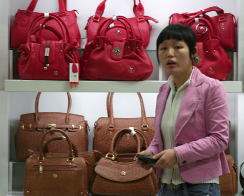 | A Chinese girl waits for customers in a booth of bags in Yiwu, East