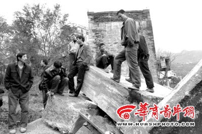 Villagers stand on a collapsed concrete bridge over the Lengshui River in west China's Shaanxi Province on November 25, 2006. Built in June 1985, the 122-metre-long bridge on the National Road 316 toppled in the early morning before dawning. In case of accidents of vehicles falling from the collapsed bridge, nearby villagers raised torches on the road to stop cars and trucks. [huashphoto.com]