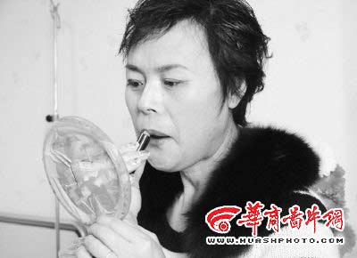 A 50-year-old man puts on makeup as he meets journalists at a hospital in Shenyang, northeast China's Liaoning Province, upon recovering from facial plastic surgeries on November 28, 2006. He said he was content with the new feminine look, and would go through the following plastic operations to change his gender. [huashphoto.com]