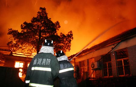 Two firefighters attempt to extinguish fire in The First People's Hospital in Chaohu City, East China's Anhui Province, November 5, 2006. The fire left nobody injured but seirously damaged severalmedical equipment rooms, Xinhua reported.[Xinhua]