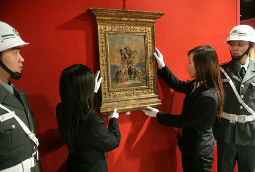 Italian art collections to exhibit in Beijing(newsphoto)Updated: 2006-12-06 11:29 2 Security officers keep guard as workers hang a creation by Italian artist Michelangelo Buonarroti, before the opening of the exhibition "400 Years Painting in Italy - Bellini Museum Collections" at the Museum of Imperial City in Beijing November 5, 2006. The exhibition is one of a series of events during the Italian Culture Year in China. [newsphoto] |