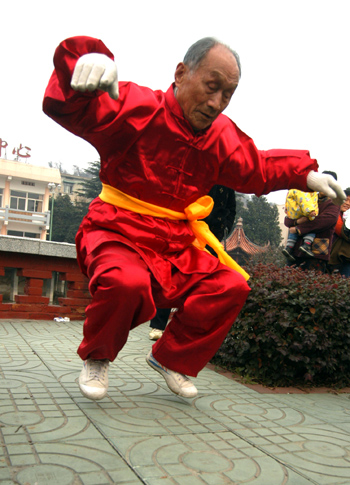 106-year-old man Guo Cairu jumps as he practises physical exercises on a community square in Nanjing, east China's Jiangsu Province December 5. [newsphoto]