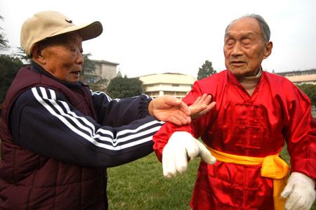106-year-old man Guo Cairu (R) and ninety-six-year-old Li Yanfu practise Tai Chi on a community square in Nanjing, east China's Jiangsu Province December 5. [newsphoto]