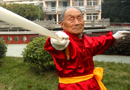 106-year-old man Guo Cairu practises with a cudgel on a community square in Nanjing, east China's Jiangsu Province December 5. [newsphoto]
