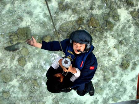 A maritime rescuer from the South China Sea Rescue Bureau holds a Chinese fisherman as they are elevated from the reef by a helicopter in Xisha Waters of the South China Sea December 15, 2006. Sixteen fishers have been rescued after their fishing boat struck a reef and grounded December 13 due to Typhoon Utor. There was still one person missing. [Xinhua]