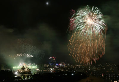 Fireworks explode over the Sydney Opera House and Harbour Bridge