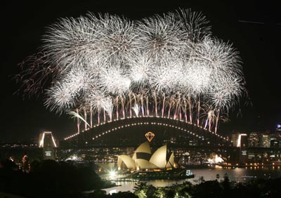 Fireworks explode over the Sydney Opera House and Harbour Bridge