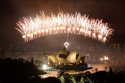 Fireworks explode over the Sydney Opera House and Harbour Bridge