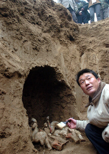 An archaeologist clears away earth from pottery figurines during an excavation of a Tang Dynasty (618¨C906 A.D.) tomb west of Xi'an, northwest China's Shaanxi Province December 31, 2006. More than thirty coloured pottery figurines have been unearthed from the tomb. [Xinhua]