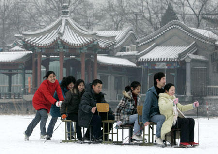 People ride on a specially constructed 'ice-chair' pushed by two women on a frozen lake after heavy snowfall hit Beijing December 31, 2006. [Reuters]