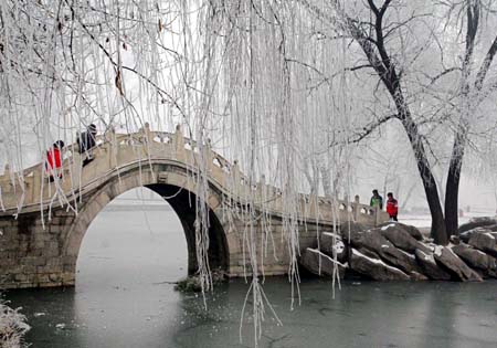 Citizens view the scenery of trees covered with Wusong rime at a park in Xingtai, north China's Hebei Province January 3, 2007. [Xinhua]