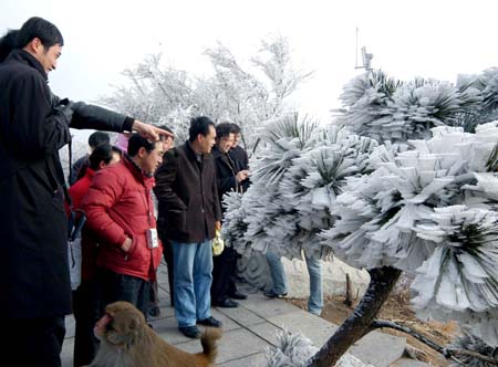 Visitors view the scenery of trees covered with Wusong rime on the Huaguo Mountain in Lianyungang, east China's Jiangsu Province January 3, 2007. [Xinhua]