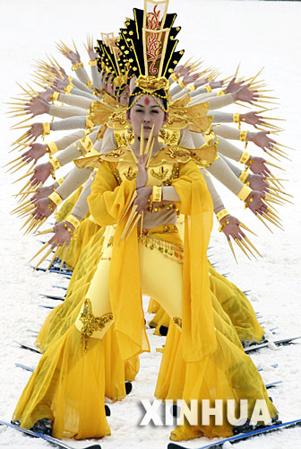 Skiers perform an outdoor version of the "Thousand-hand Kwanyin" dance at a local ski resort for the 23rd Harbin International Ice and Snow Festival on January 6, 2007. The annual festival raised its curtain one day earlier, with highlights including cultural exchanges between China and Canada, South Korea and Russia. [Photo: Xinhua]