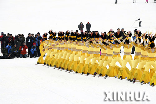 Skiers perform an outdoor version of the "Thousand-hand Kwanyin" dance at a local ski resort for the 23rd Harbin International Ice and Snow Festival on January 6, 2007. The annual festival raised its curtain one day earlier, with highlights including cultural exchanges between China and Canada, South Korea and Russia. [Photo: Xinhua] ![]()