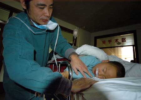 A child is tended after a corrective surgery of cleft lip at Hangzhou Plastic Hospital in Hangzhou, east China's Zhejiang Province January 8, 2007. Funded by the Smile Angel Foundation which was established by pop diva Faye Wong and her husband, first nine children with cleft lips and palates in Hangzhou underwent operations on Monday, and were expected to recover in two weeks. [newsphoto]