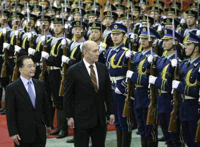 Israeli Prime Minister Ehud Olmert and China's Premier Wen Jiabao (L) attend