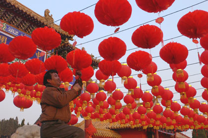 Workers are busy hanging red lanterns to add