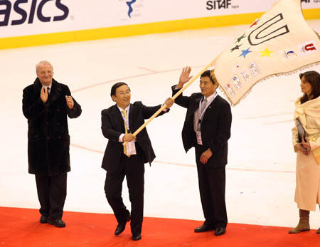 Cheng Youdong (second from left), Executive Vice Chairman of the 24th Winter Universiade Organizing Committee and Vice Governor of Heilongjiang Province, waves the Universiade flag at the closing ceremony of the 23rd Winter Universiade in Torino, Italy January 28, 2007. The next Winter World University Games will be held in Harbin of northeast China's Heilongjiang Province in 2009. [Xinhua]
