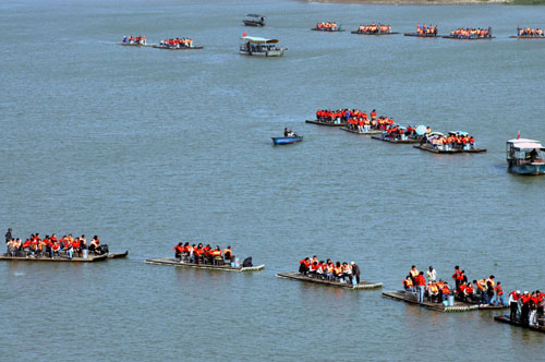 Tourists ride on bamboo rafts down the Wanquan River in Qionghai, south China's Hainan Province January 28, 2007. The tropical island province is attracting a large number of holidaymakers as the vast land of China undergoes winter. [Xinhua]