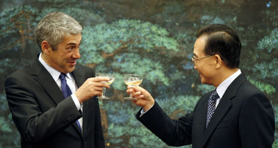 visiting Portuguese counterpart Jose Socrates toast after witnessing a bilateral