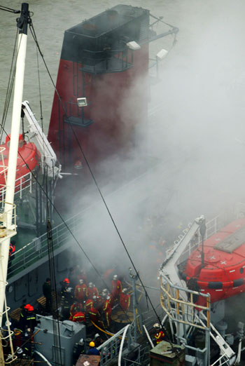 Dense smoke rises from "Kaili" fishing vessel berthed at a dock on the Huangpu River in Shanghai February 13, 2007. Equipments in the 7,000-ton ship were burnt out when the fire was put out, with no one injured in the accident. [newsphoto]